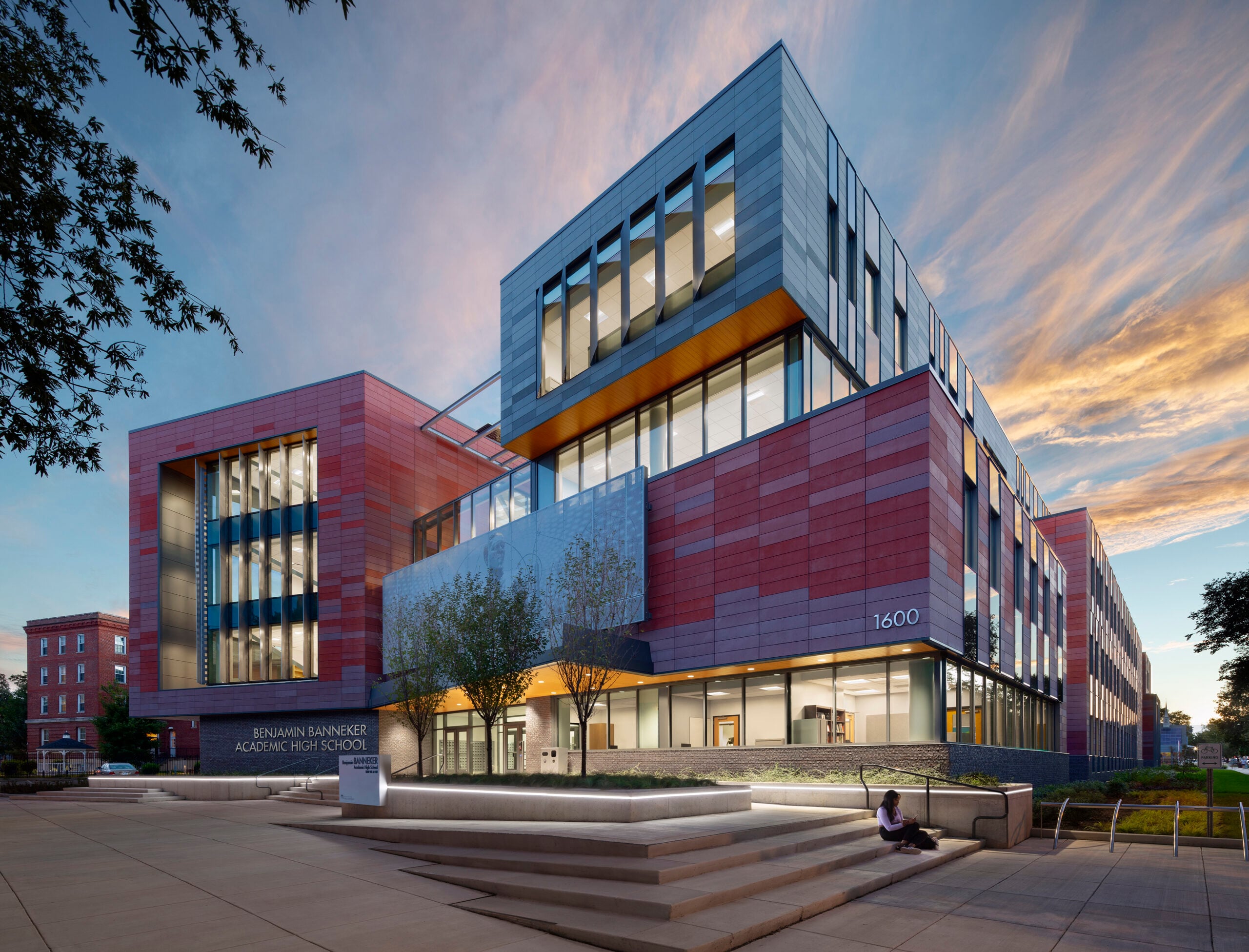 For its design of the new building at Benjamin Banneker Academic High School—a public school in the historic center of Washington, D.C.—Perkins Eastman DC employed holistic strategies to deliver social, economic, and environmental value. The heart of the building is a four-story Central Learning Commons, a unifying atrium that connects academic programs and social spaces, culminating in the “Skyplace” terrace with views of the Washington Monument.