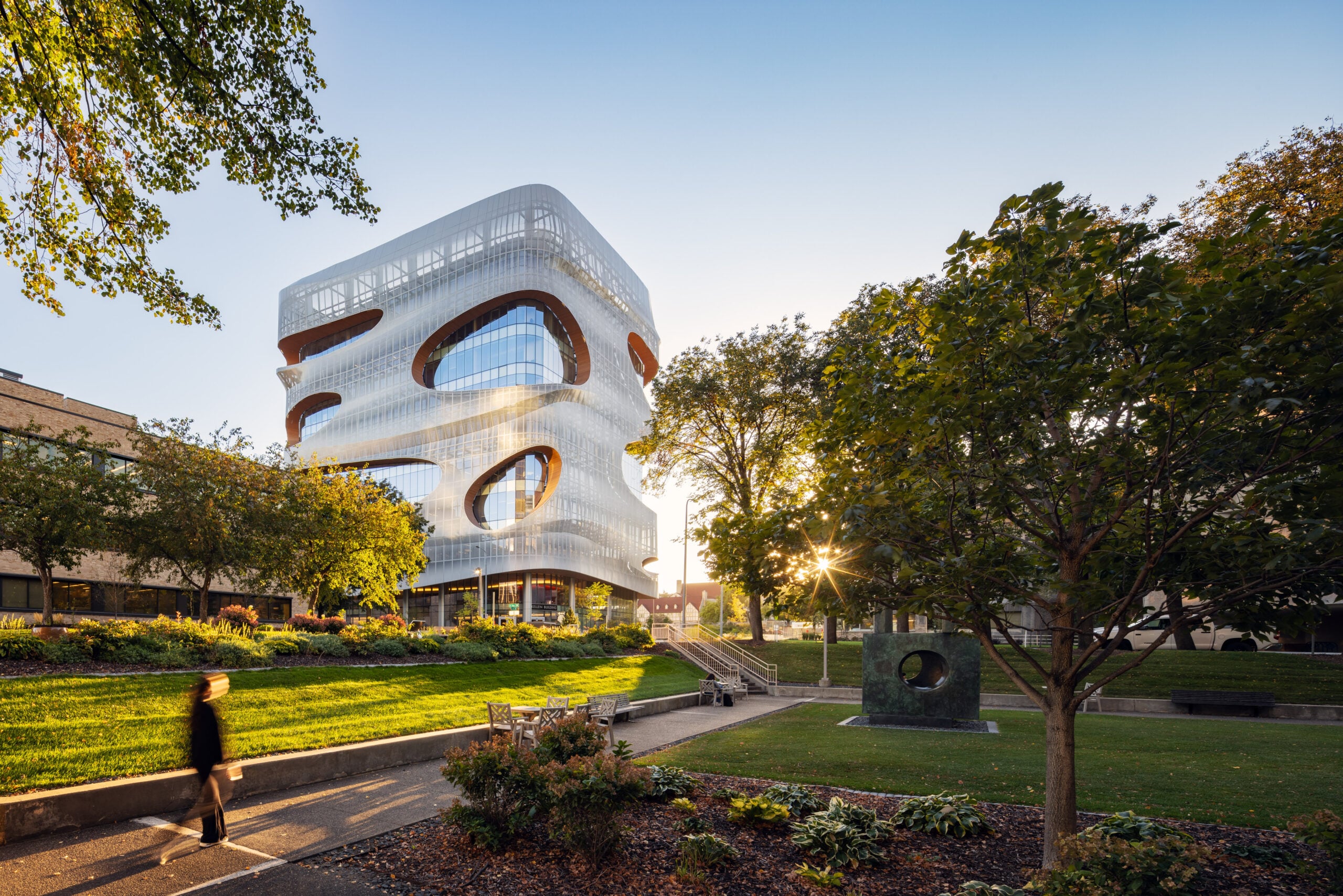 A risk-zoned floorplate organizes wet, damp, and dry labs for optimized safety and energy efficiency, while a distinctive parametric metal scrim—drawn from Mayo’s three-shield logo—modulates daylight, reduces glare, and enhances performance. Inside, natural materials, unassigned workstations, and integrated technology cultivate a flexible, equitable, and wellness-focused research environment. All-electric systems, passive cooling, and layered ventilation cut energy use intensity by 40 percent compared with baseline.