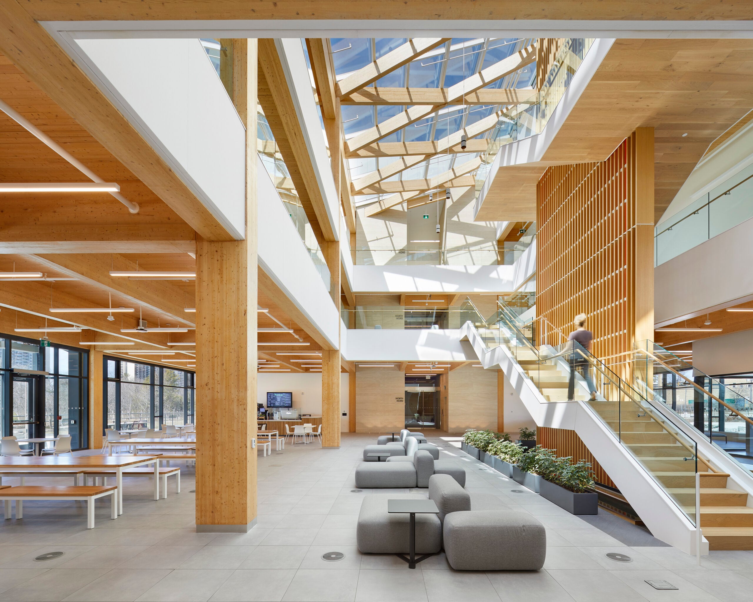 A highly efficient, mass timber facility, the Ontario Secondary School Teachers’ Federation (OSSTF/FEESO) Headquarters and Multi-Tenant Complex functions as a hub that continues to support public education in the province, provide healthy workplace environments for its staff and visitors, and responsibly meet the organization’s goals of financial resiliency.