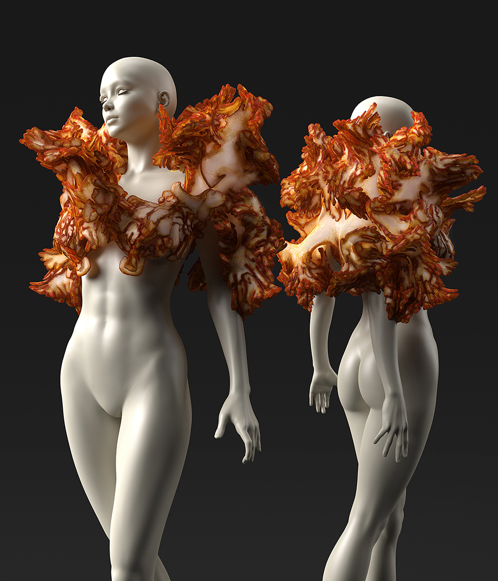 Wanderers is a project we are working on in collaboration with with the Silver Lab and Stratasys. It began with the observation that synthetic biology allows designers to manipulate the functions of microorganisms, which could then be made into useful products. To explore this, we set out to design 3D-printed wearables that use synthetic organisms. One such wearable, Mushtari, was produced by Stratasys for the recent Euromold show and is the first demonstration of a photosynthetic wearable. It has been redesigned to house synthetic microorganisms that fluoresce bright colors in darkness, produce sugar, and manufacture biofilms. These functions augment the experience of the wearer by altering color, creating food, and producing biological tissues such as insulation for the body.