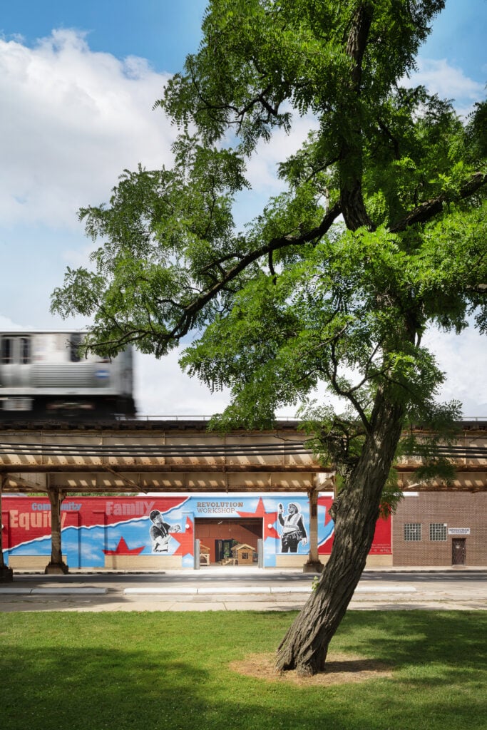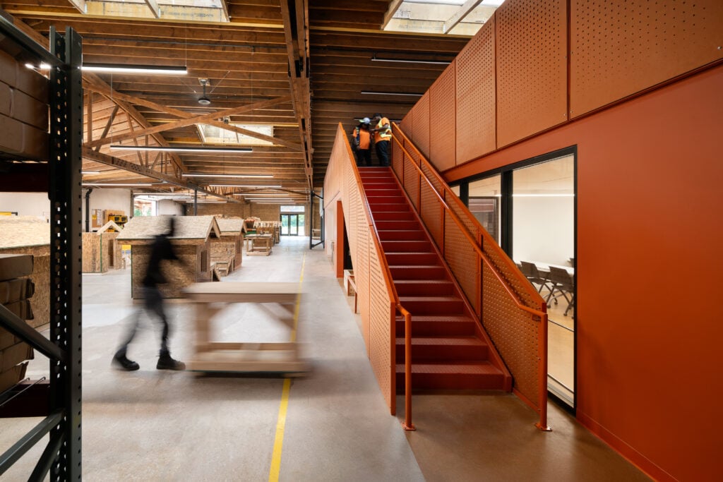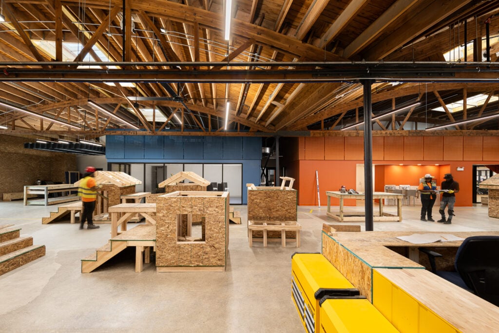 Founded in 2017 in a former soda warehouse, Revolution Workshop expanded into an adjacent warehouse. Here, they teach people from underrepresented communities wood framing, electrical installation, HVAC, and more.