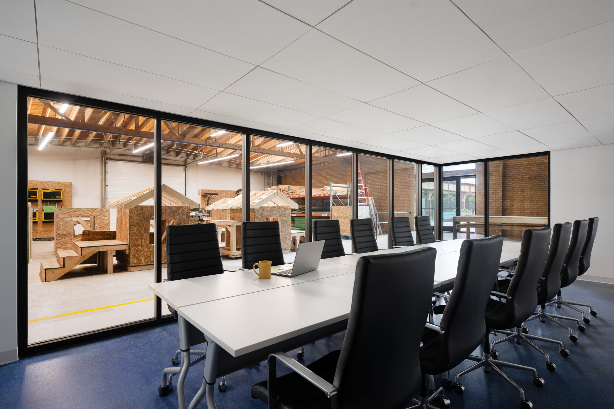 The primary task for Lui’s design was to acoustically divide the noisy shop floor from the quiet office and classroom functions. Future Firm divided the combined building north-to-south, keeping the rowdy shop floor closer to the rumbling elevated train to the south, and acoustically sealing and conditioning the northern section for classroom and office use. These spaces became even more critical in light of Revolution’s suite of wrap-around supportive services: training on financial literacy, mental health, and job placement.