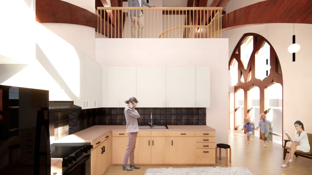The church’s most prominent exterior feature is its triple-height arched Gothic window lined in wood tracery, and Canopy’s design will restore it and add operable sections. This window will span across multiple units, showcasing intimate scenes of family life where there was once only an empty clerestory void.