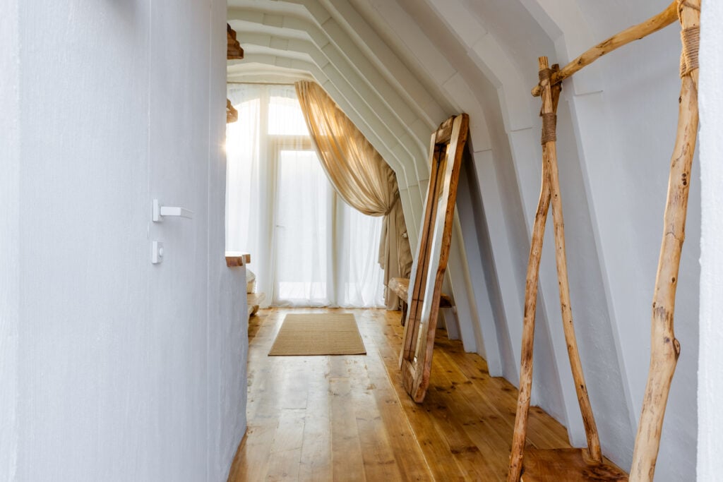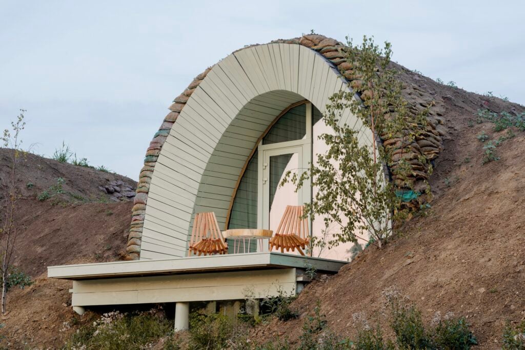 Inside, the Hobbit Wake Houses feel both ancient and modern—like something found rather than built. Rounded ceilings absorb sound, and the hand-finished walls diffuse light into a soft, mineral glow. “We wanted guests to feel a sense of deep comfort and quiet surprise,” says Mirza. “Visually, the cabins blur with the earth, but inside they offer warmth, textured surfaces, and hand-crafted details that invite touch and contemplation.”