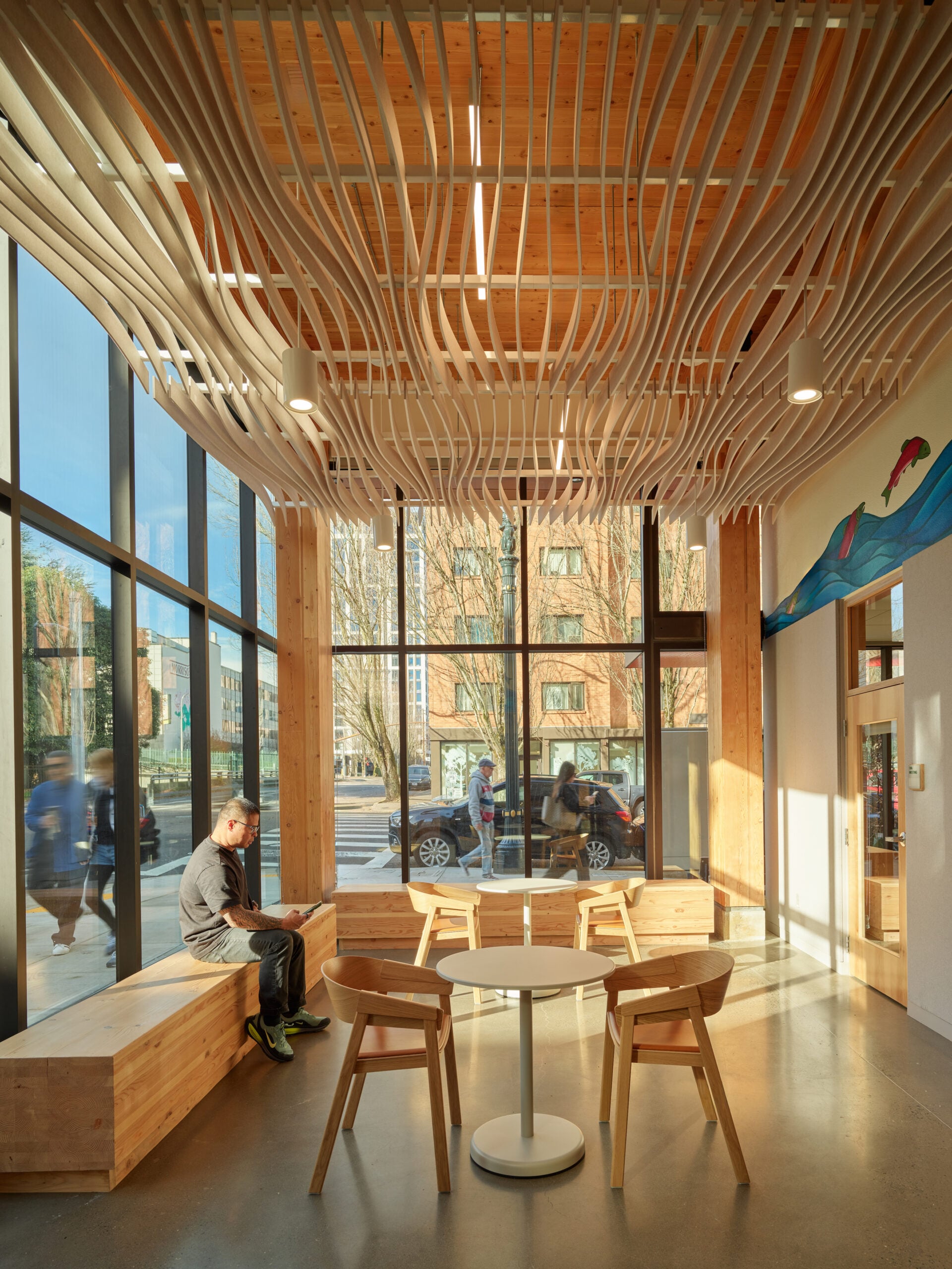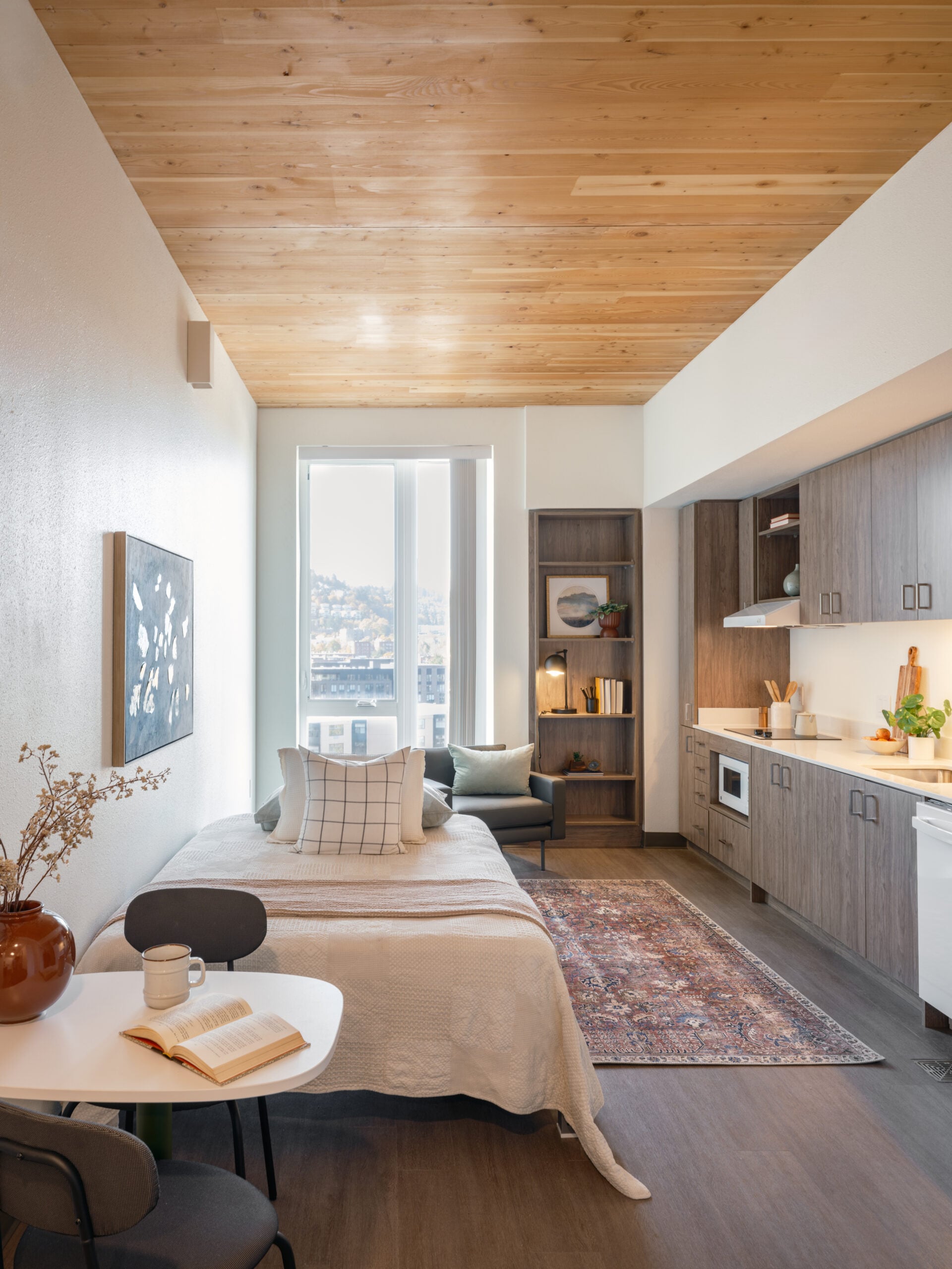 Inside, shared spaces are carved into the building’s massing through a basalt-like vertical fissure that references the Columbia River. Exposed timber structure is concentrated in the lobby and common areas, paired with glass and acoustic baffles, while residential levels remain quiet and homey with ceilings exceeding nine feet and near floor-to-ceiling windows.