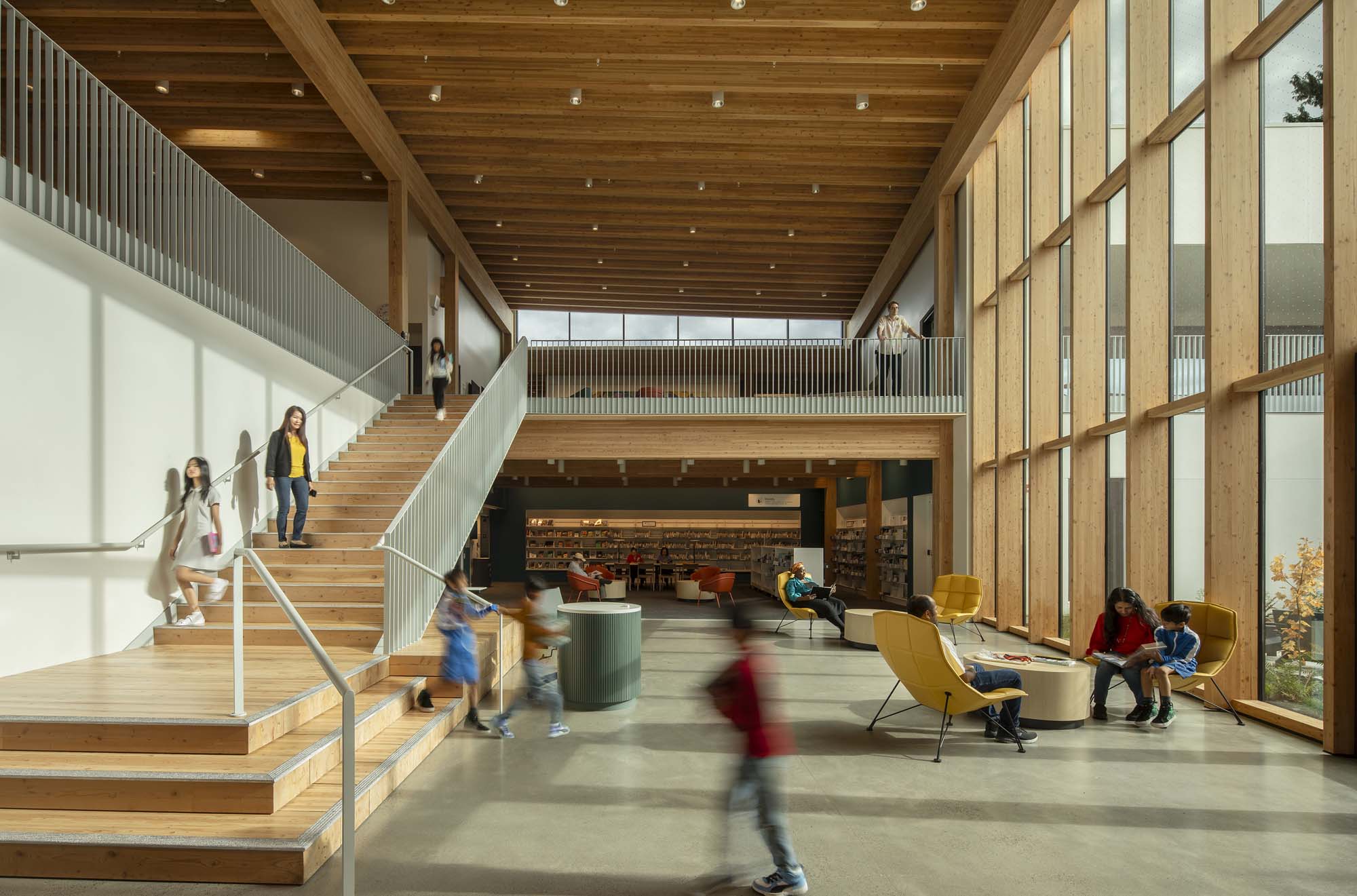 The addition, clad in brick to complement the surrounding historic district, houses the majority of the library’s new public spaces: a teen center, maker spaces, classrooms, a community room, and a garden courtyard that extends the library into the neighborhood. At its heart is a soaring, double-height main reading room that relies heavily on mass timber and glulam sourced from Pacific Northwest forests, including tribal lands and federal restoration projects. Locally commissioned artworks—including colorful murals and hanging sculptures inside and out—embed Black history, music, and culture into a variety of spaces.