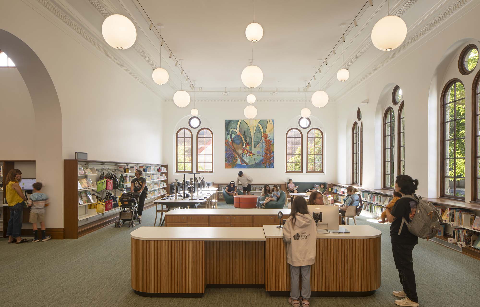 In response, LEVER located the children’s library within the historic Carnegie building, allowing generations to overlap in a space layered with memory. The Spanish Renaissance structure has been rehabilitated, with long-sealed arches reopened, windows restored, and the stucco façade refreshed. A reconstructed cornice discreetly conceals major seismic and acoustic upgrades, bringing the century-old building up to contemporary standards. Inside, the rooms feel intimate and ceremonial—a counterpoint to the openness of the new addition beyond.