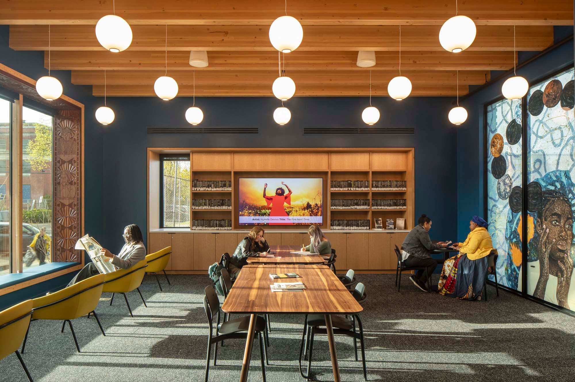 The historic structure has been restored and seismically upgraded. Next to it, the addition’s dark offset brick and wood elements echo the surrounding neighborhood while clearly signaling a contemporary chapter. Reading rooms and gathering spaces, visually linked to the Black Cultural Center from multiple points, include warm wood surfaces, exposed structure, and generous daylight.
