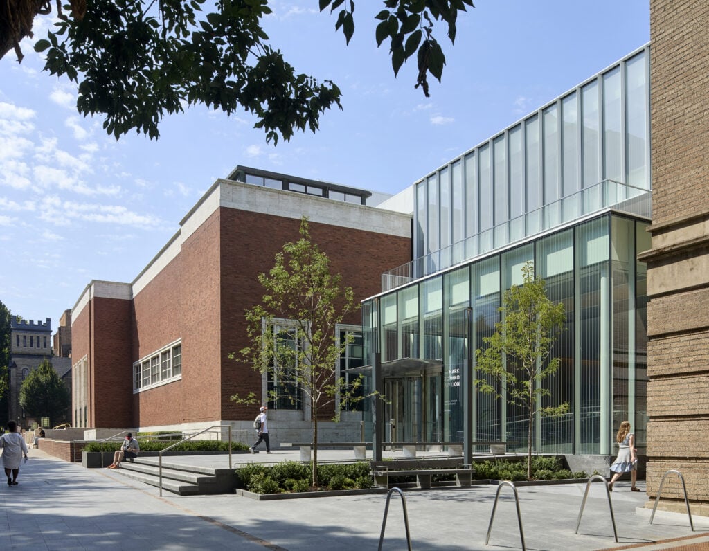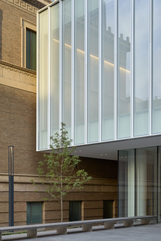 Opened in November, this glass-walled, 21,881-square-foot space, designed by Chicago’s Vinci Hamp Architects and Portland’s Hennebery Eddy Architects, connects and is set back from the downtown Portland museum’s two historic structures: the Main Building, a Modernist landmark by Pietro Belluschi completed in 1932, and the Mark Building, a circa-1926 former Masonic temple designed by Frederick Fritsch. Previously, the buildings’ interiors had been connected only underground, making the unified museum circuitous at best. Now, every floor connects to the next.