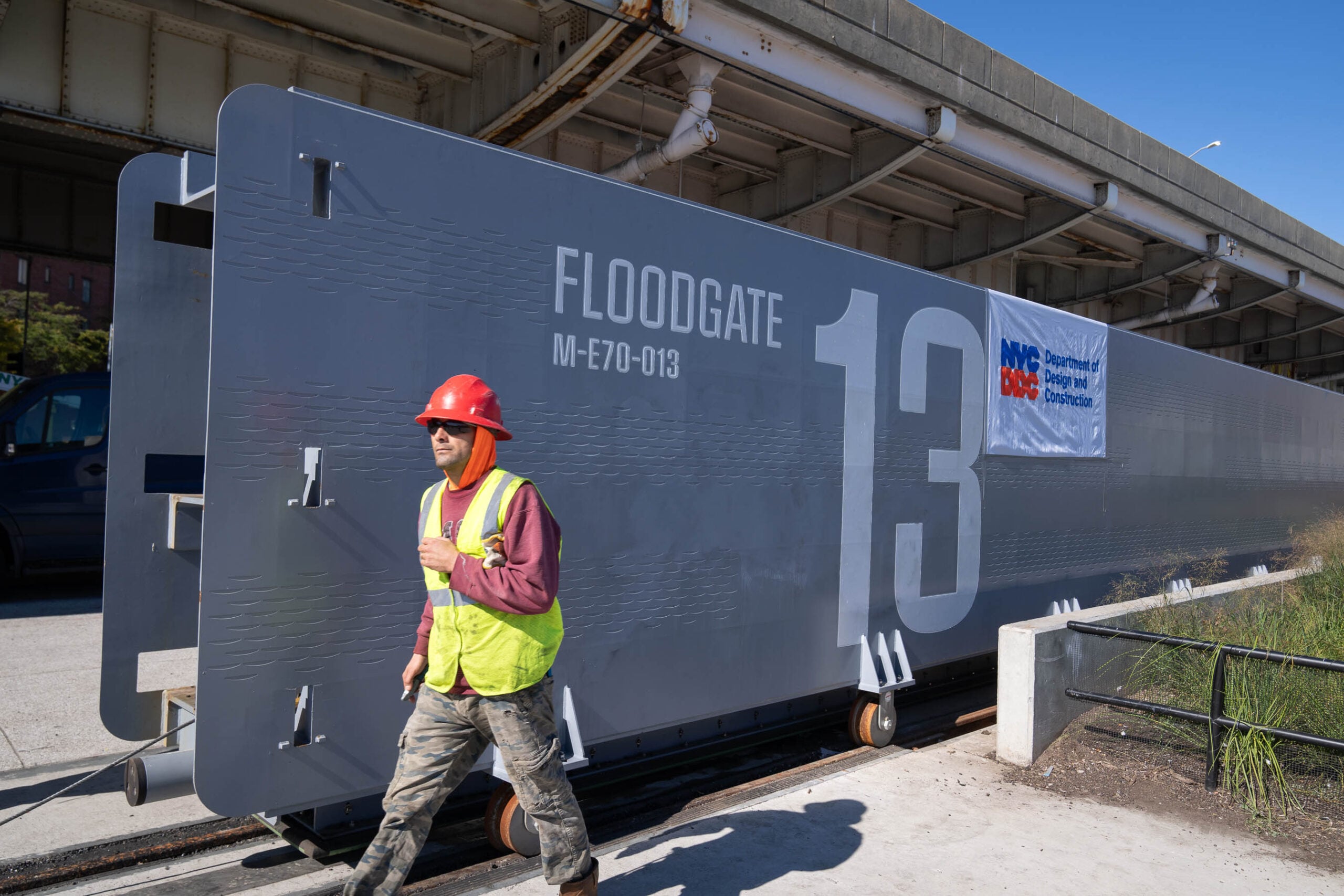 Though the approach to flood protection in the East River Park section of ESCR hewed to a more naturalistic “Bridging Berms” principle, the northern sections of ESCR make use of above-ground, operable floodgates that can slide or swing open as a storm approaches. There, the subterranean floodwall of East River Park emerges above ground and runs below the elevated FDR Drive, providing flood protection in a more visually explicit way. (Other parts of the BIG U, like at Battery Park City and the Financial District, make more extensive use of the operable gates.) The wall and gates themselves can’t be adorned or planted to enable regular inspection, but Ilijevich said they do have “concrete formwork with a wave pattern depending on users’ interface with it” – walkers, runners, cyclists, or drivers. “The waving creates a sense of scale and acts as a subtle wayfinding,” Siegel added. Elevation markings and floodgate numbering offer further bits of navigation aid and public pedagogy.