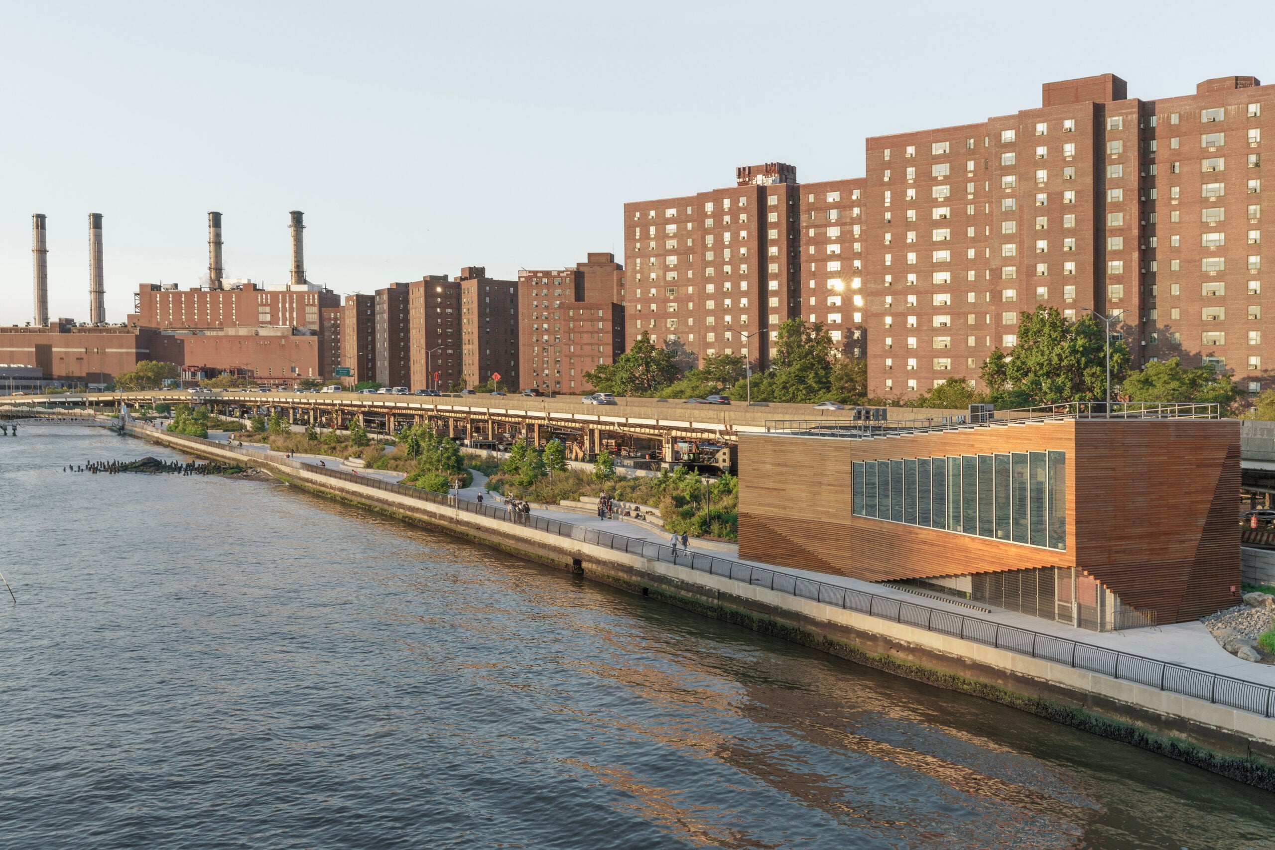 But the project’s most significant contribution was not just to provide de rigeur landscape design. East Side Coastal Resiliency (ESCR), as the broader work along the Lower East Side and East Village waterfront is known, delivers generational flood resiliency through a subterranean flood wall and berm that runs along the spine of the park. The aim is to shield the community from inundation, the likes of which it experienced in a big way in 2012, when Superstorm Sandy sent floodwaters nearly 14 feet high into the neighborhoods behind the new park – primarily NYCHA public housing and residential co-op buildings.