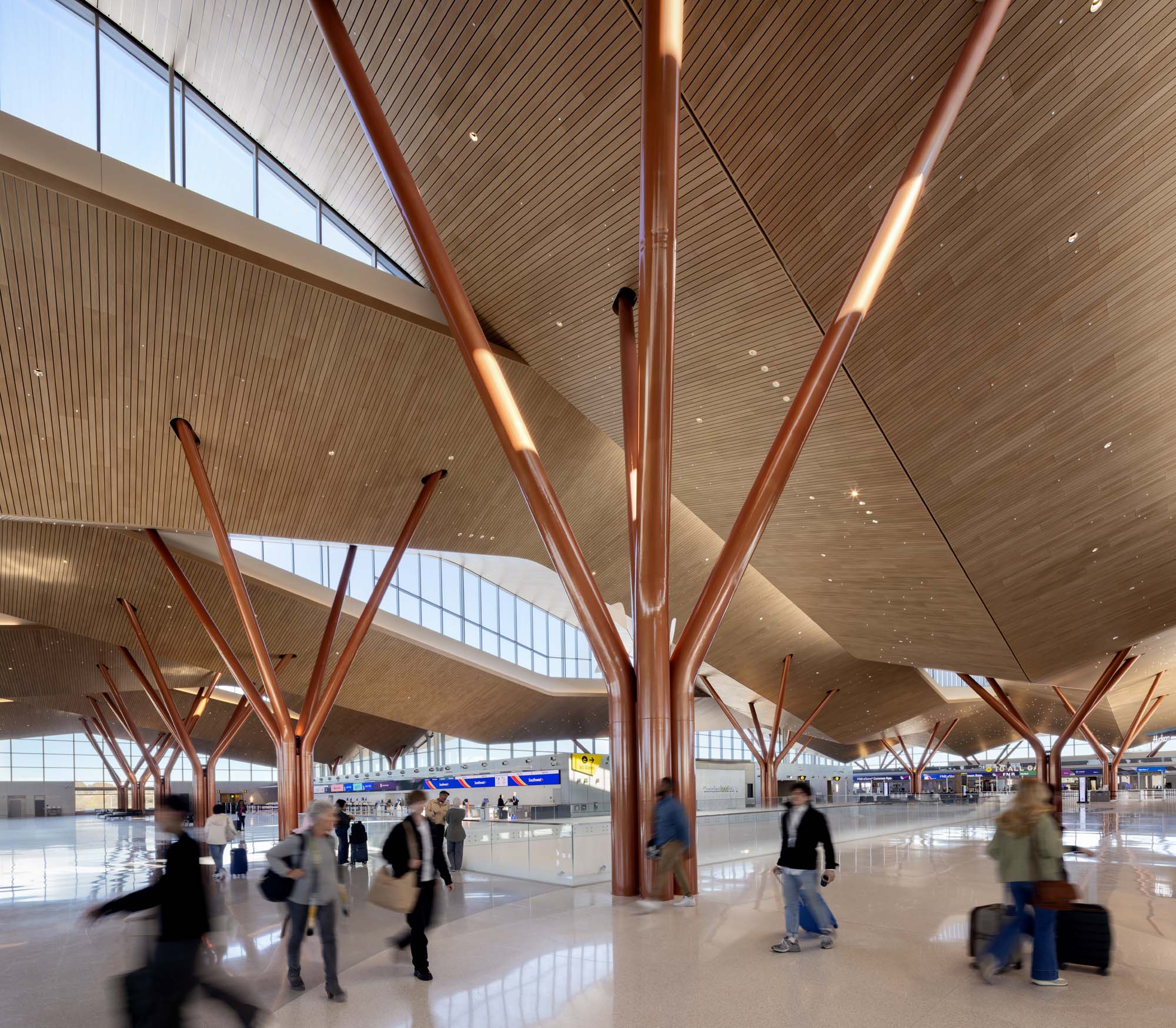 Clerestory glazing and strategically placed skylights flood circulation areas with natural light while avoiding glare at ticketing counters and security lanes. At night, constellation-like lighting embedded in the ceiling references the region’s dark skies.