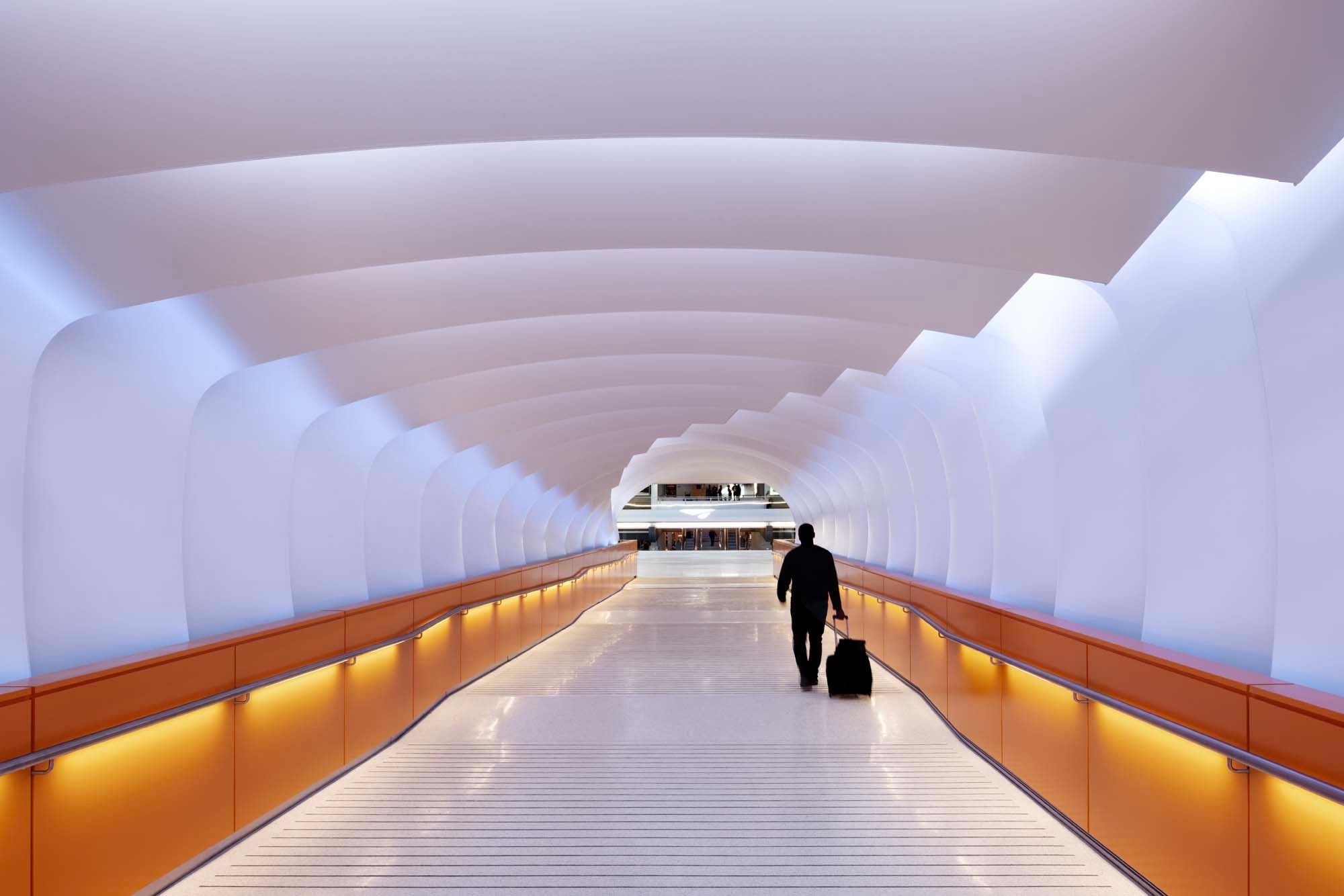 One of the project’s most distinctive spaces, designed by Vidal, is the “Petal Tunnel,” connecting the landside terminal to the renovated airside core. Inspired simultaneously by Pittsburgh’s Fort Pitt Tunnel, with its dramatic reveal of the city skyline, and the petal-like forms of the nearby Phipps Conservatory, the passage is lined with sculptural ribs that change length and color as passengers move through. Integrated lighting responds to daylight conditions, shifting from cool whites to warm ambers and violets.