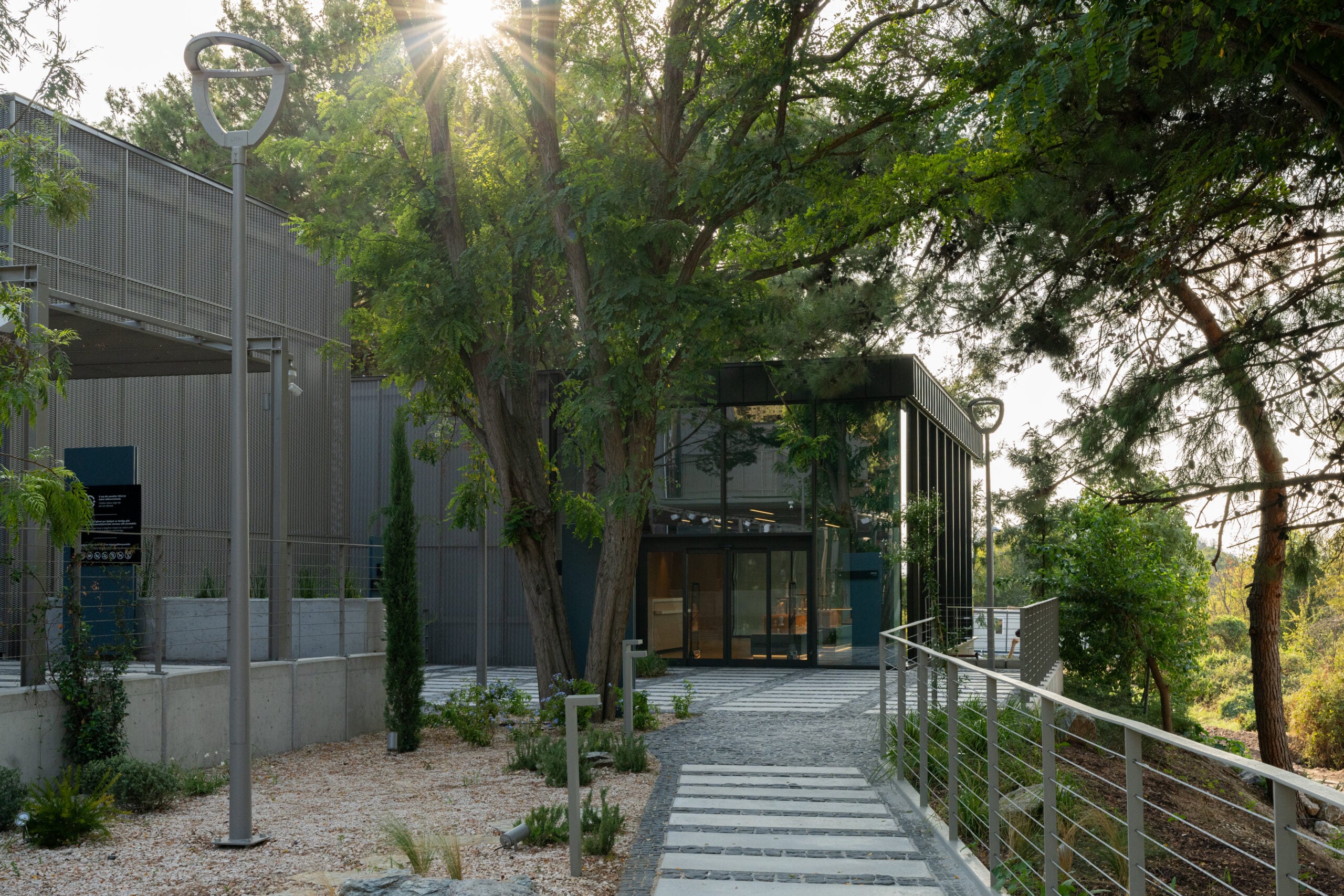 According to Nico Lorenzi, PR coordinator at Atelier Brückner Gmbh, the firm responsible for designing the building, the museum’s exteriors were kept deliberately minimalistic and the architects used “reflective surfaces mirror[ing] the surrounding pine trees and landscape, allowing it to visually ‘disappear’ into its setting.” Unlike the marble ruins of the archaeological site, which stand out starkly in the rolling Mediterranean terrain, the EEM’s grey buildings are carefully tucked behind trees and landscaping.