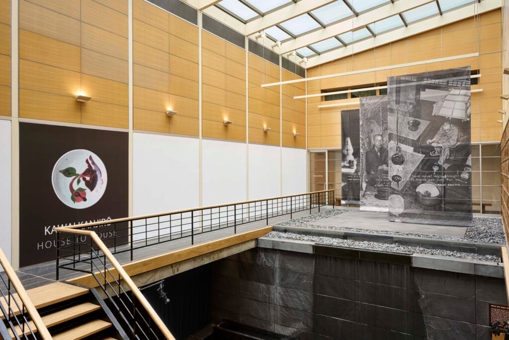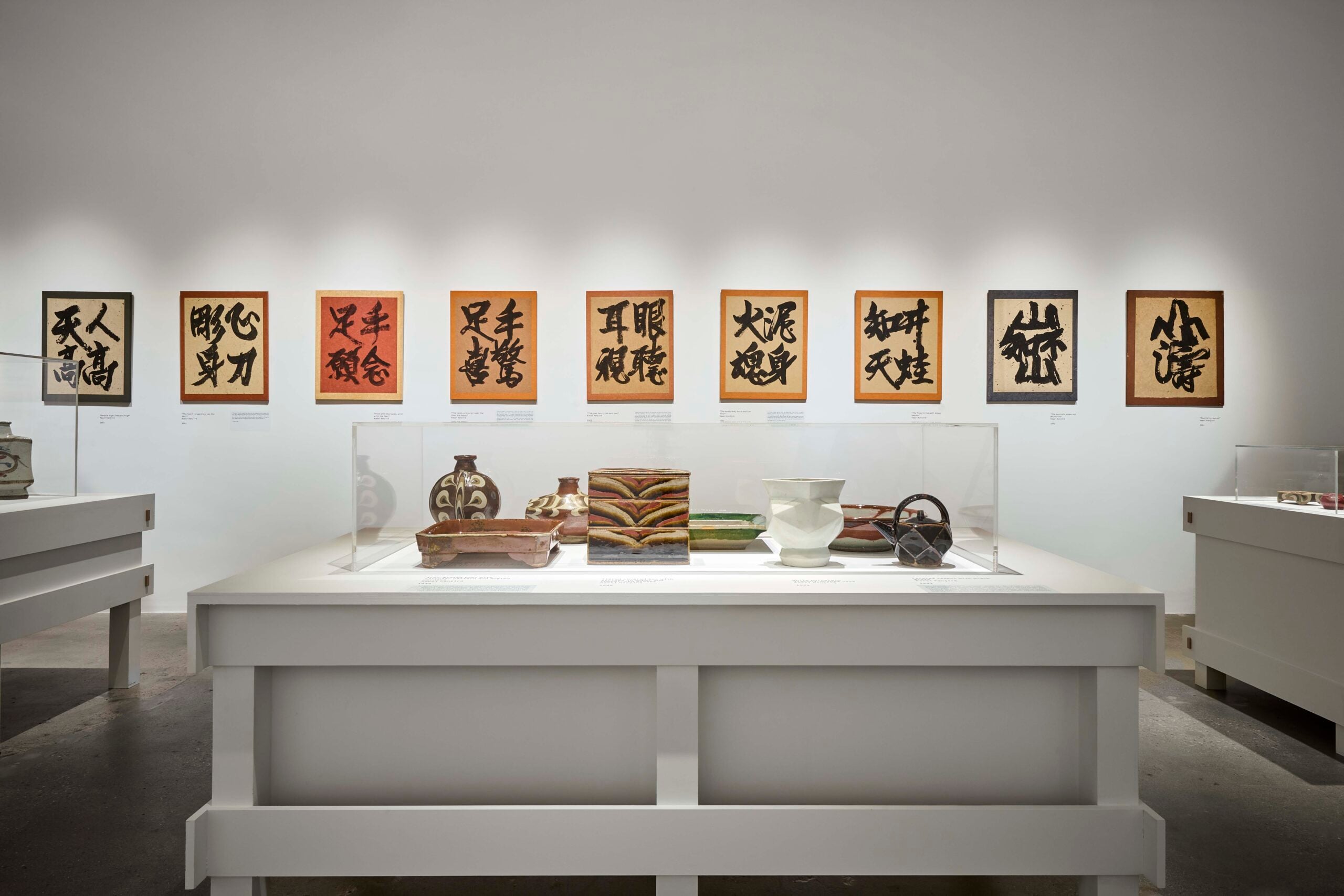 The white display tables and cases throughout the galleries were designed to evoke the joinery of the Kyoto home’s construction, and the various heights of the tables allude to the different heights at which works are arranged throughout the home’s interior. On the walls surrounding the tables, visitors will see a selection of Kanjirō’s 1960s calligraphy of poems that read as Zen meditations. One, in particular, stands out: “The eyes hear; the ears see.”