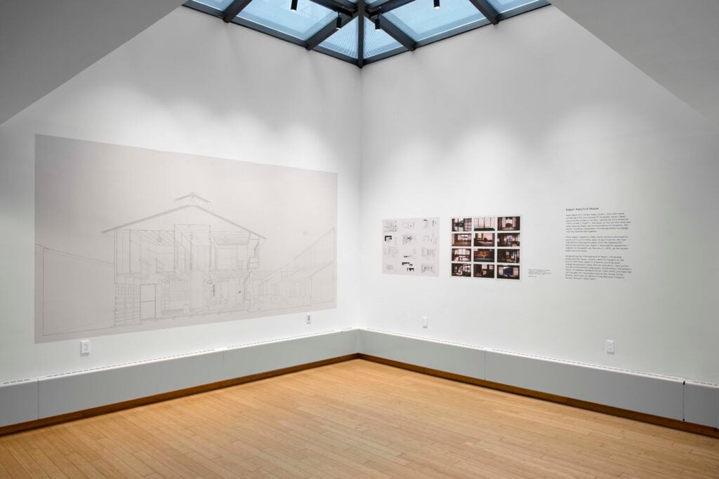 “One is immediately impressed by [the house’s] massiveness and sturdiness,” wrote Uchida. “There is nothing flimsy or unstable about it.” The Japan Society evokes this sentiment through the display of a large section drawing that shows the mechanics of the home, alongside another wall of perspective sketches and photographs of the interior of the house (made in situ by the Rome-based exhibition designers, Milk Train.)
