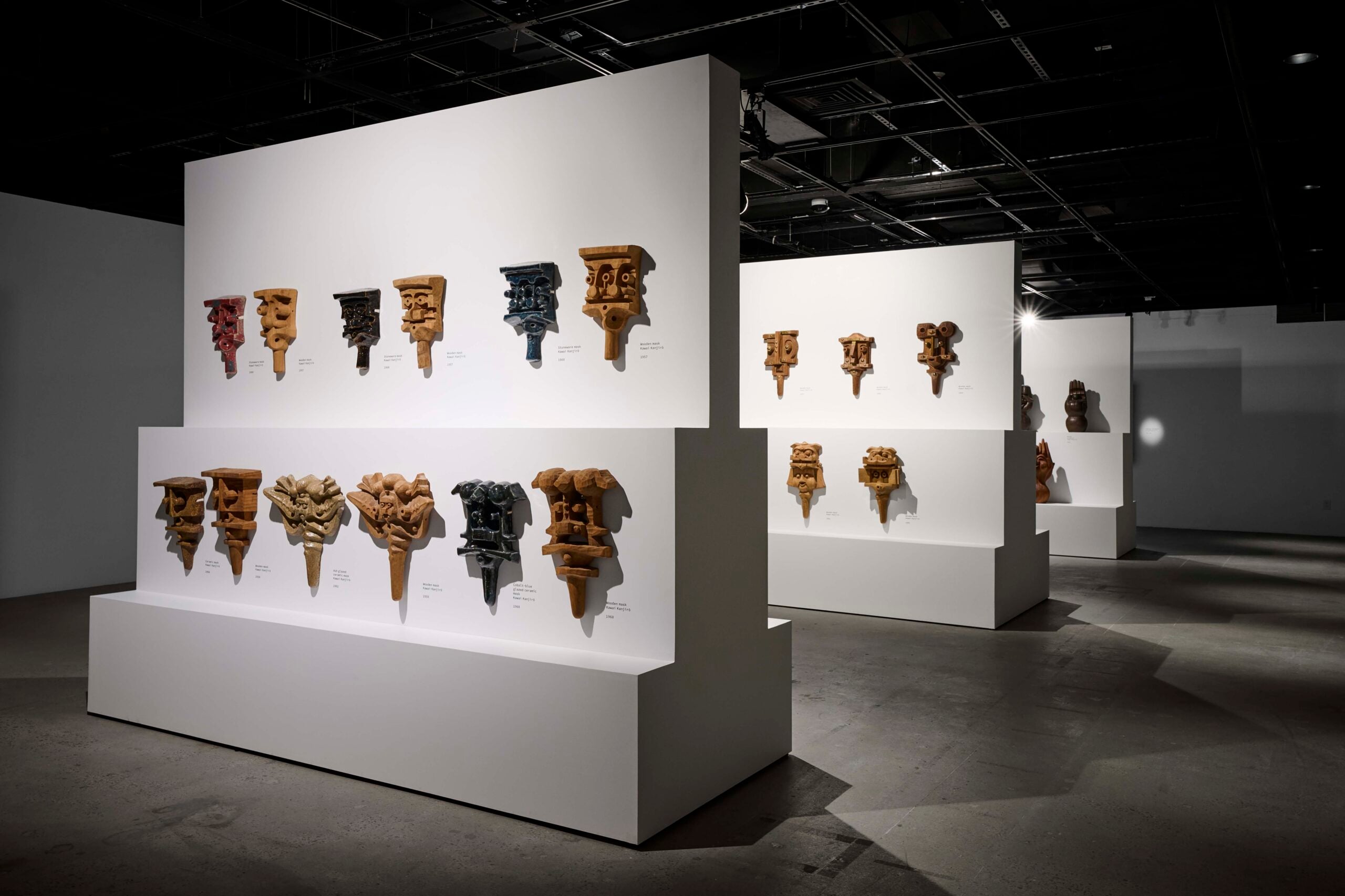 Japan Society’s main gallery presents Kanjirō’s ceramics chronologically, from his earlier Chinese and Korean inspired works, to his later, more abstract and asymmetrical vessels splashed with his signature, hand-mixed copper, iron, and cobalt glazes. The last room is dedicated to the artist’s experimental late-career wooden sculptures and masks that echo the same motifs as his ceramics—hands pointing to the sky, figures from Japanese folklore, and of course, cats.