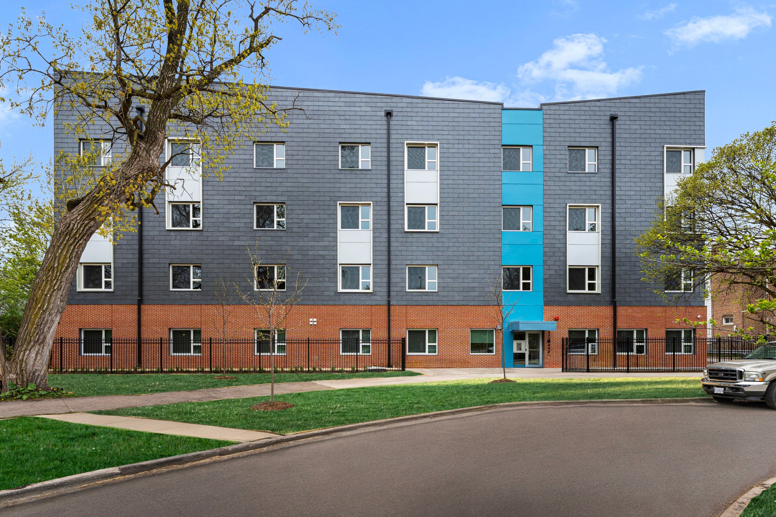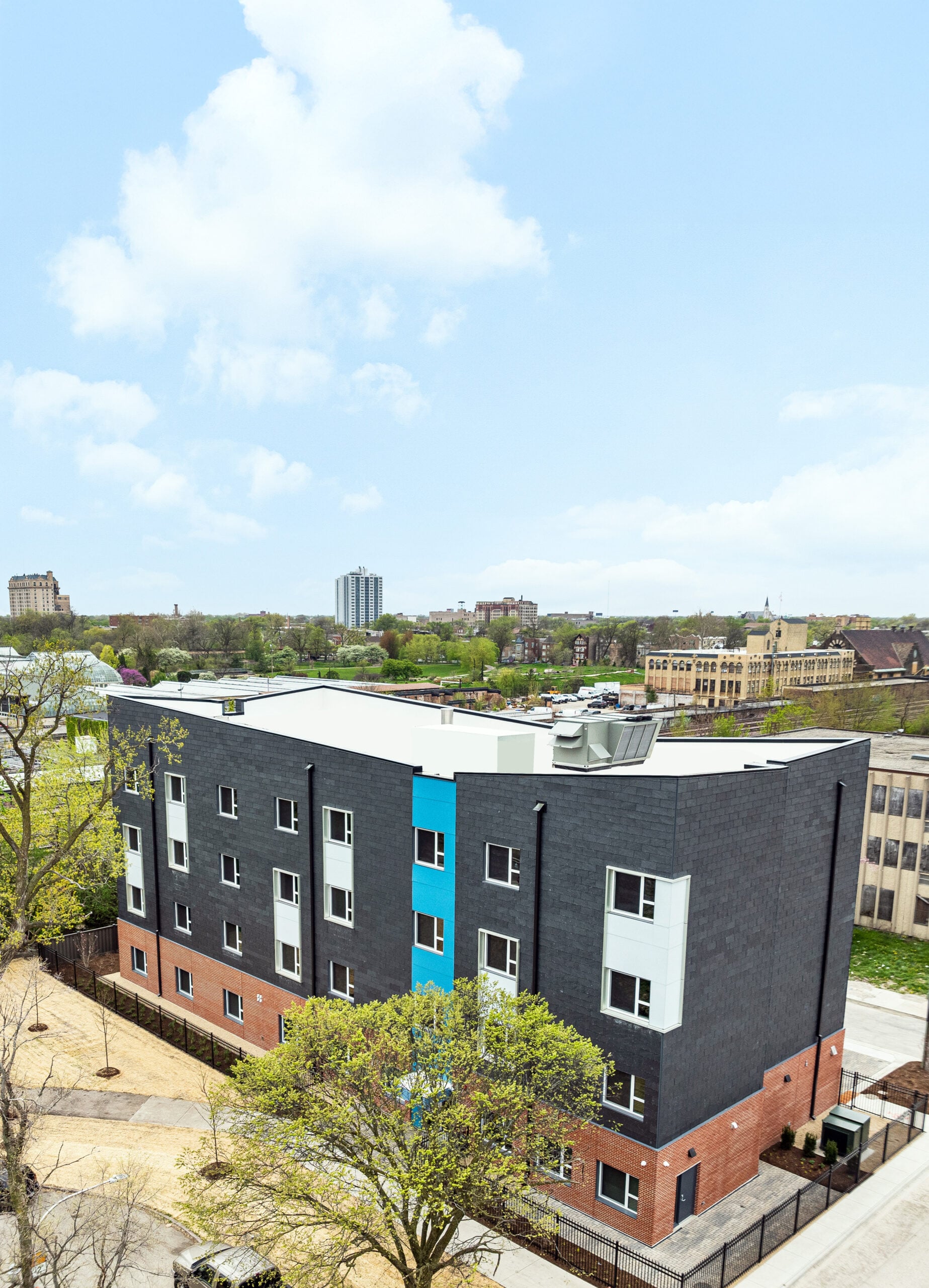 Another project in Chicago, the Conservatory Project—an affordable housing initiative—used our 201 Vanguard system with exposed stainless-steel clips, adding architectural interest. This project was for Passive House certification, focusing on energy efficiency. Our rain screen system accommodated continuous exterior insulation, aiding in achieving that certification. It’s the largest affordable housing Passive House project in Chicago, showcasing slate’s environmental and cost benefits.