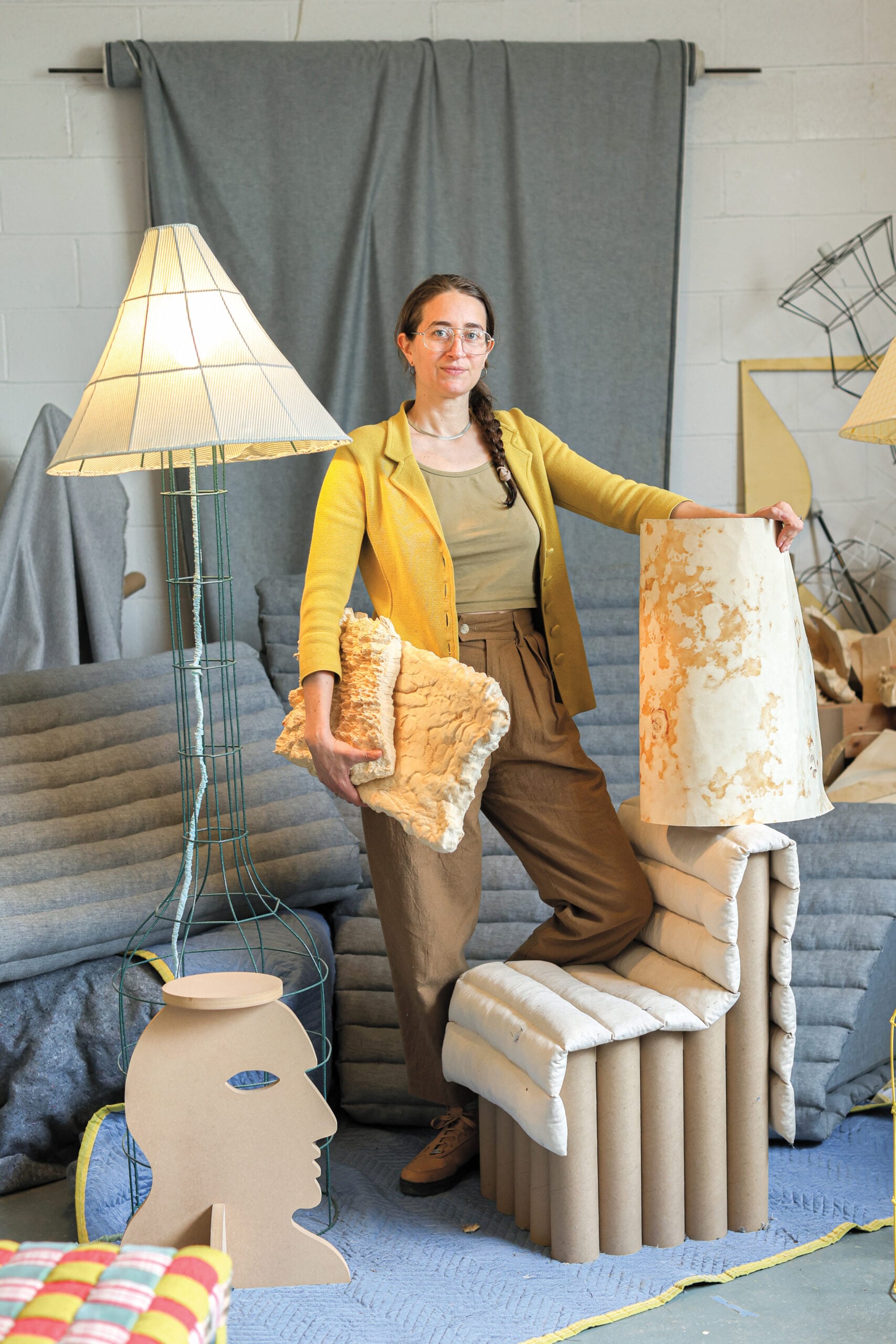 “I appreciate Ecovative as they are not just doing alternative leathers for fashion but are targeting some of the most insidious and polluting petroleum-based products/materials,” she says. During her fellowship, McMahon focused on using the springy mycelium-based “foam” as a substitute for upholstery foams, making two seating pieces with the material and some lighting prototypes.