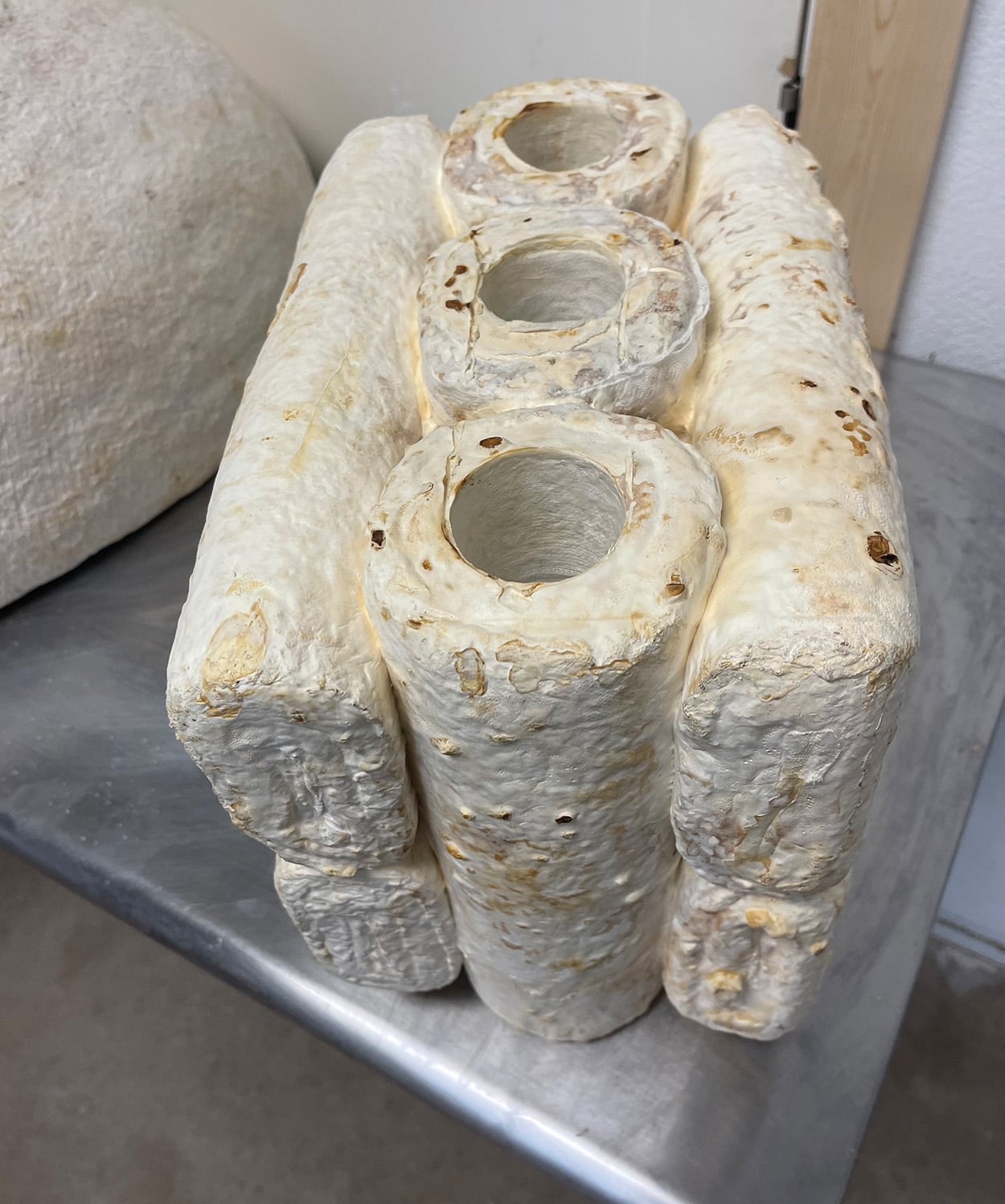 Elise McMahon, circular product designer of New York–based studio LikeMindedObjects, began experimenting with the material when she was awarded Ecovative’s 2024 Forager Design Fellowship, a program that provides students and independent designers with access to mycelium-based materials for creating innovative and sustainable designs.